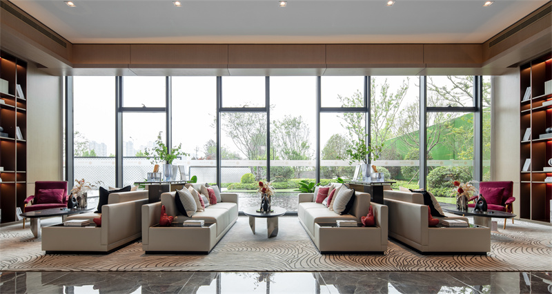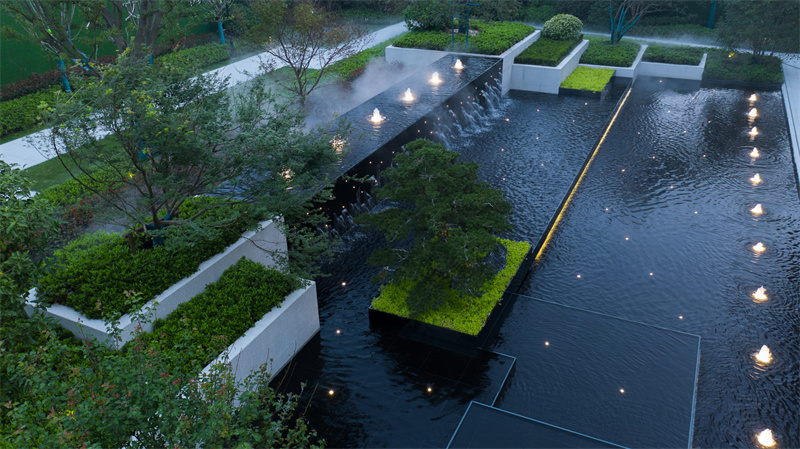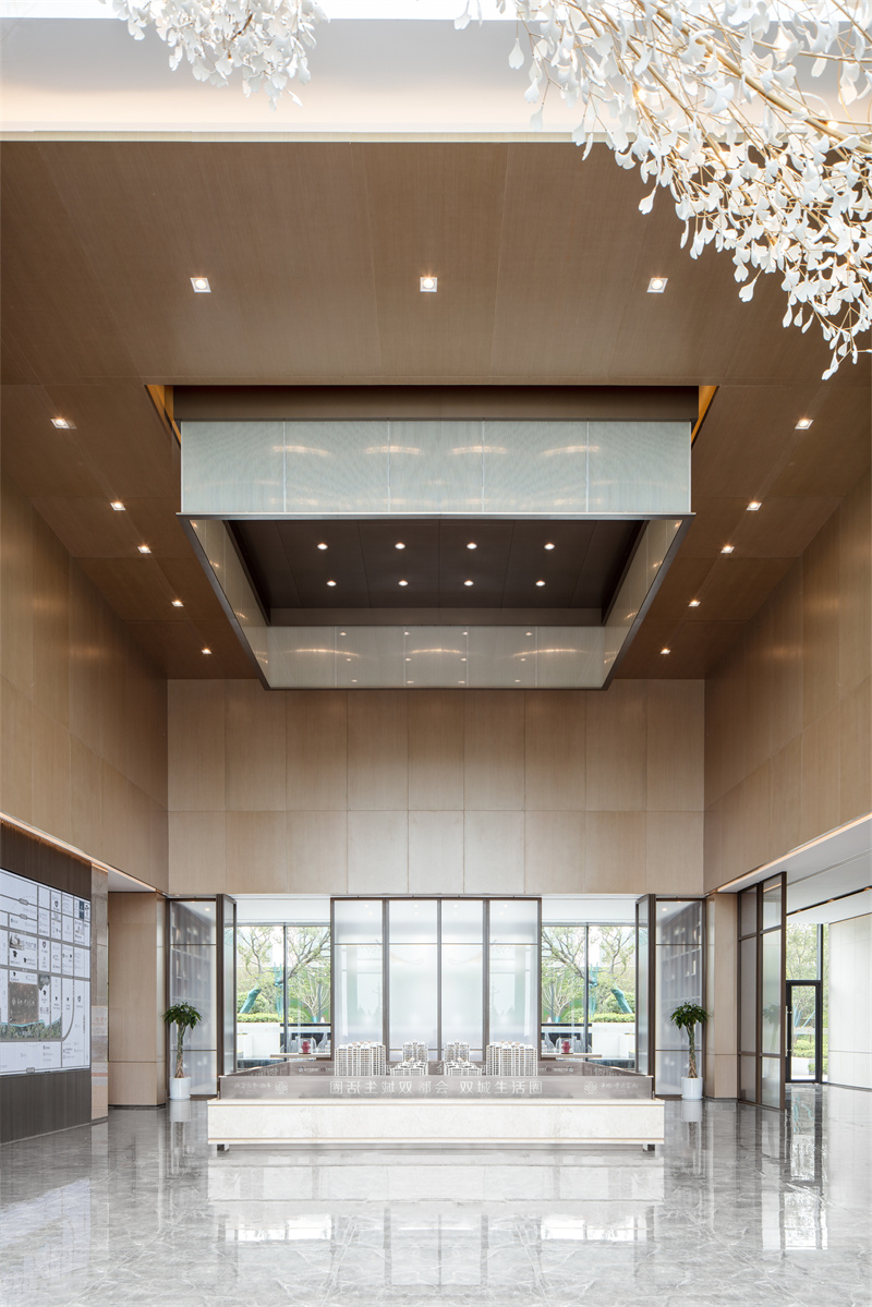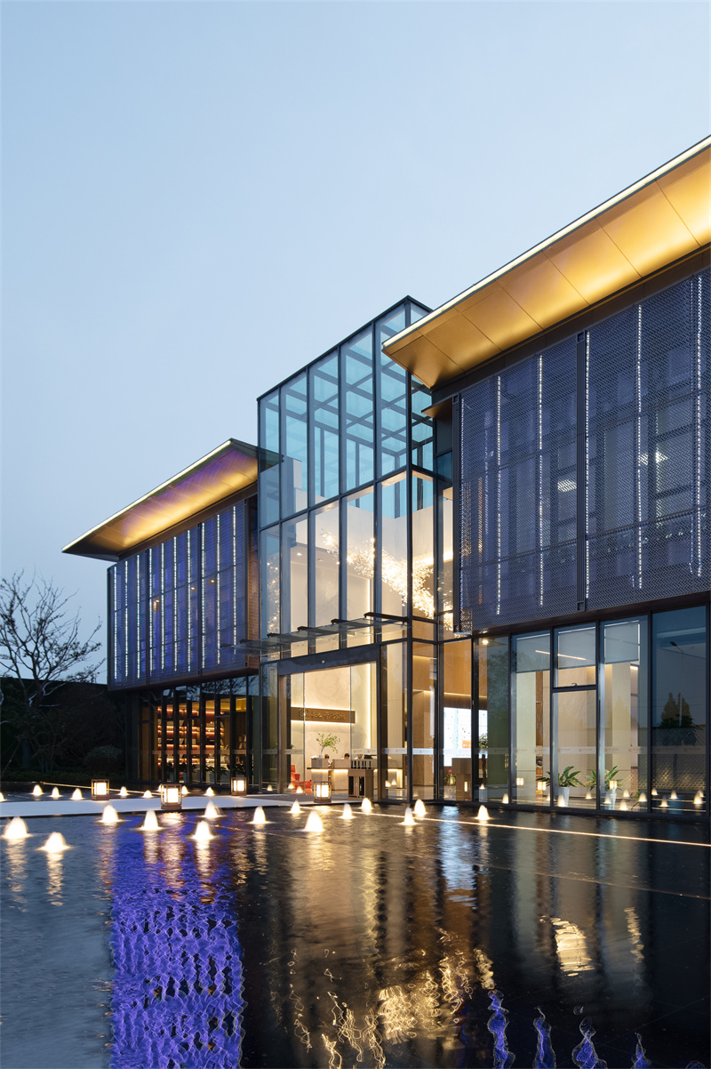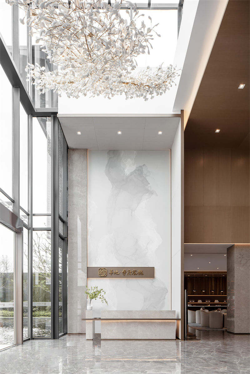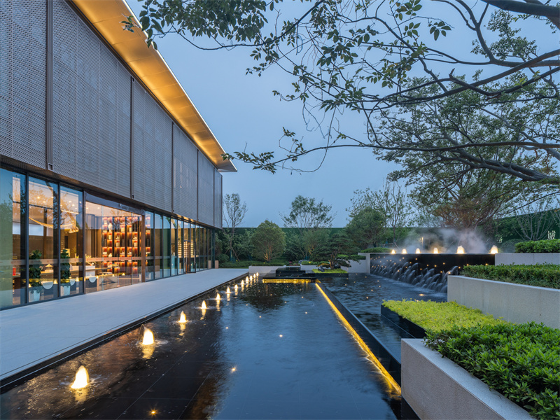 為致敬當地文化特色,以水做為環境的靈魂,一進迎賓,二進觀湖,三進尋瀑,將水揮灑到極致,在整個空間場景中呈現一場靈動的詩意美學。流水潺潺淙淙,仿佛輕奏歌謠,迎接每一位來賓的到訪,人與生活的嶄新通道,也借由這片水景,緩緩打開。
