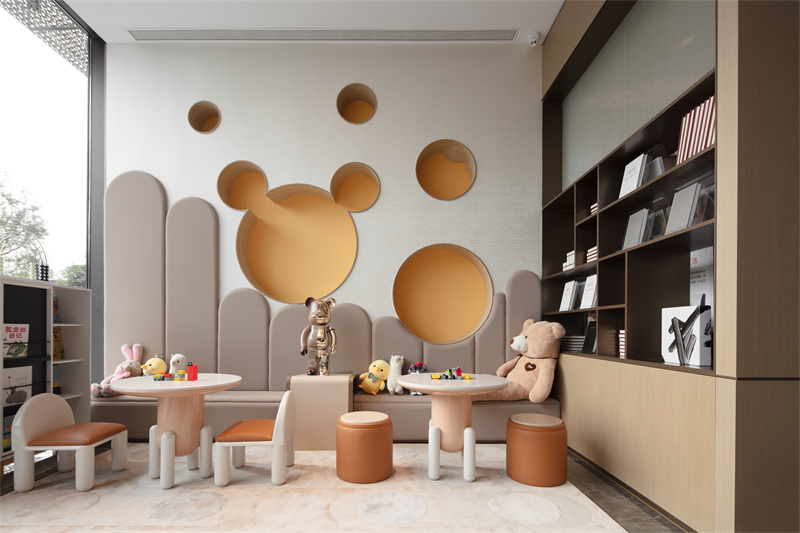 低飽和度的色彩搭配,點綴以明亮的黃色與橙色,整體空間充滿活力與童趣。這個靜處一隅的兒童閱讀區,緊鄰洽談區與樣板間,讓生活的美好在這一刻就被感知。