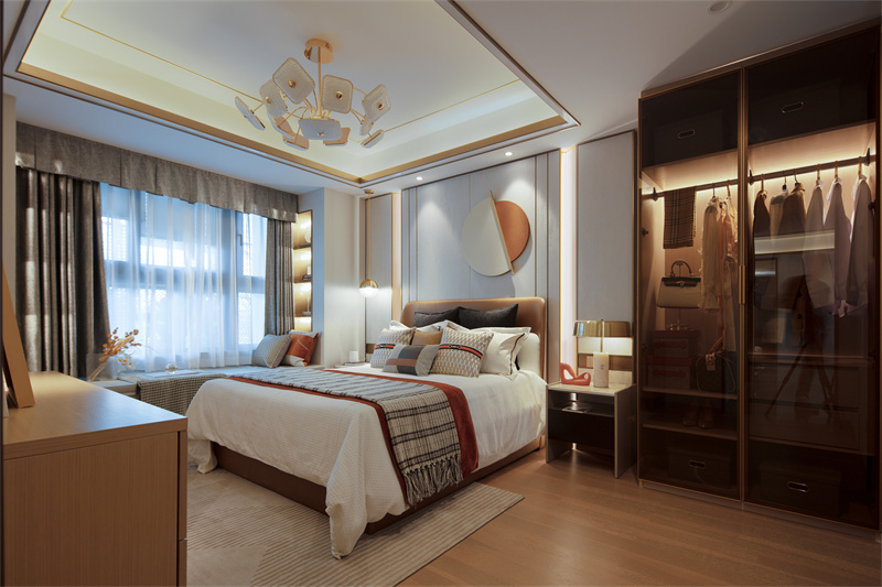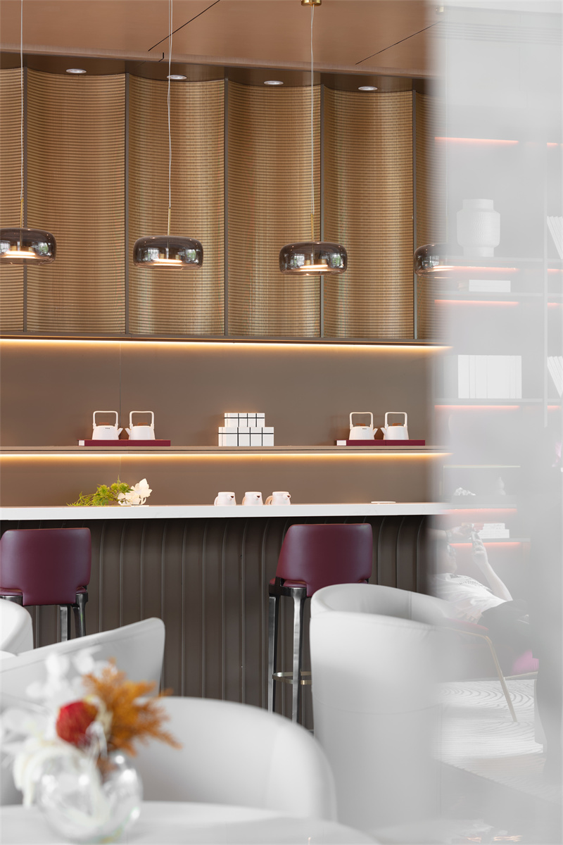 空間運用大面積木色墻面與灰色系瓷磚、局部以沉穩的褐色與柔媚的紅色調和,傳遞出現代、優雅、奢貴的氣質。水吧金屬波紋背景墻和玻璃吊燈,把水之美展現地淋漓盡致,創造多層次的感官體驗。