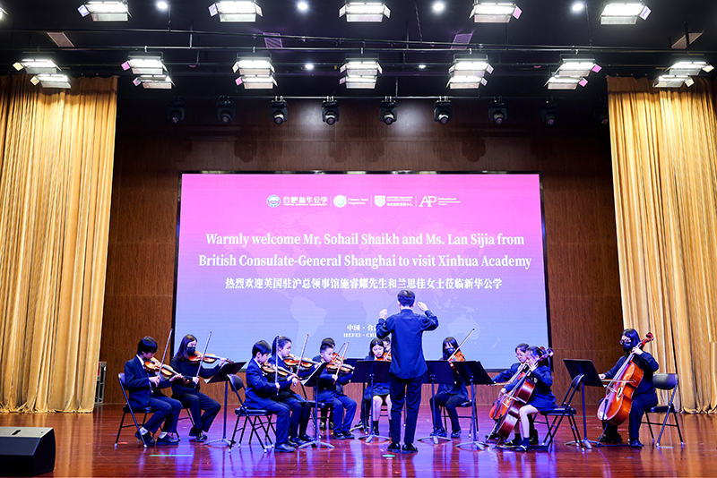 5月25日下午14:00時,英國商業(yè)貿易部公使銜參贊施睿耀先生、英國商業(yè)貿易部教育與技能司高級貿易投資官蘭思佳女士一行來訪,合肥市教育局辦公室張媛主任陪同,新華公學總校長秦新春、融合部校長溫晨瑋、行政副校長吳晶晶等校領導熱情接待。首先在報告廳舉行了簡單的歡迎儀式,新華國際青少年樂團用精彩的表演對來訪嘉賓表示了熱烈的歡迎。