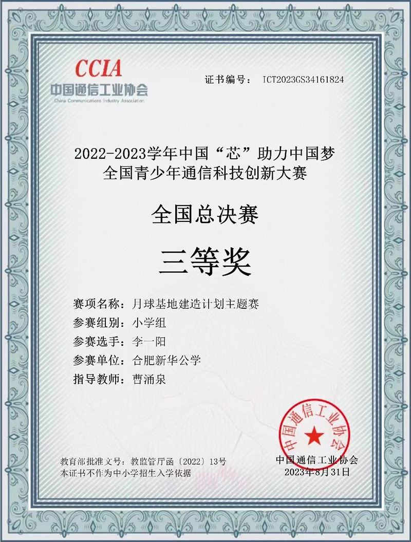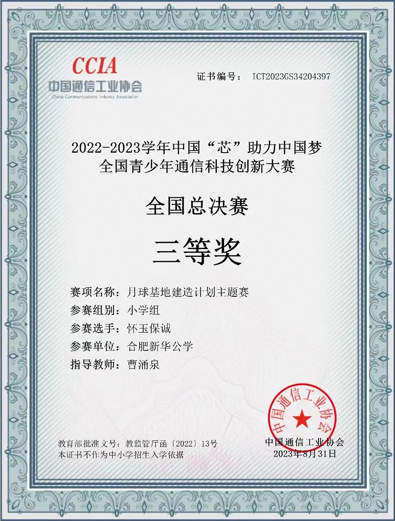 新華少年,未來可期!我校雙語部小學(xué)懷玉保誠、曾李宸、牛牧遙、李一陽四名同學(xué),在“2022-2023學(xué)年中國‘芯’助力中國夢全國青少年通信科技創(chuàng)新大賽”中獲得全國三等獎!此次大賽共2000余人參與角逐,我校學(xué)子能夠在眾多高手中脫穎而出,實屬可喜可賀。