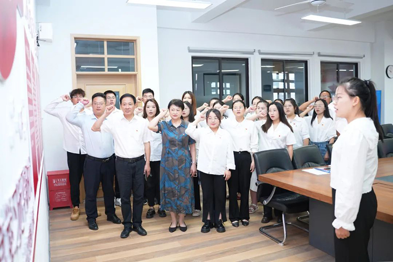 大會最后,黨員教師黃皖琪帶領全體黨員集體重溫入黨誓詞。面對鮮紅的黨旗,大家嚴肅認真,響亮的誓言再次讓大家感受到黨員的使命與擔當。