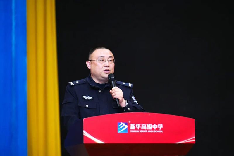 儀式伊始,新華高級中學黨支部副書記、副校長吳東向在座師生介紹新任法治副校長——雙墩派出所葉欣然警官。
