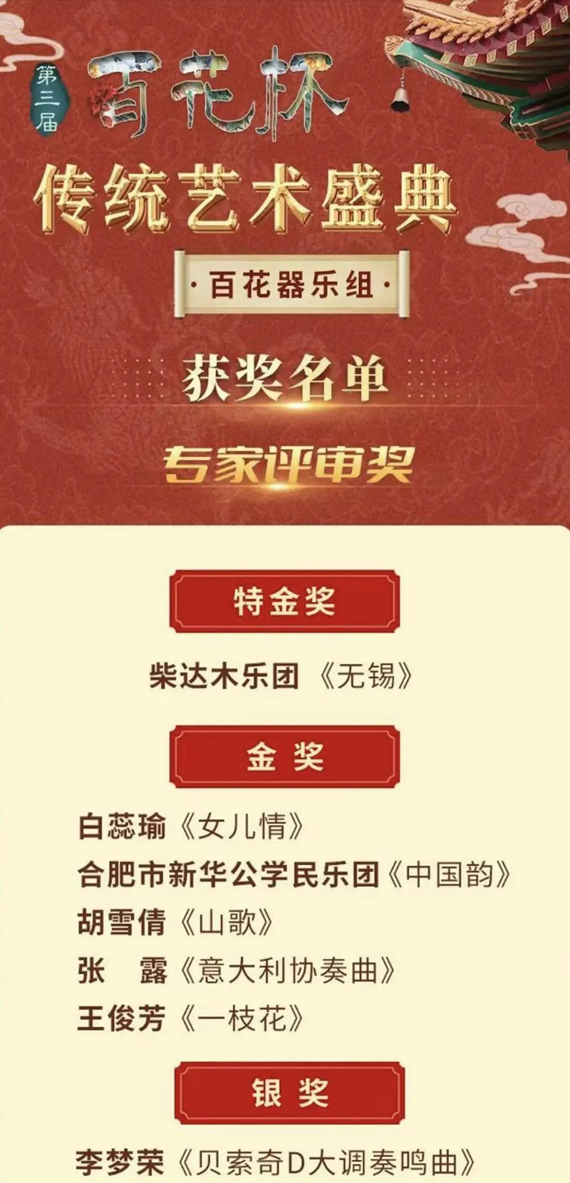 在百花獎頒獎典禮的舞臺上,新華公學民樂團的同學們精神飽滿,演奏了經典曲目《中國韻》。他們的演奏如行云流水,音符間傳遞出深厚的民族情感,展現了極高的藝術水準?,F場觀眾沉浸在美妙的音樂中,掌聲雷動。最終,憑借精彩絕倫的表演,新華公學民樂團脫穎而出,榮獲金獎。