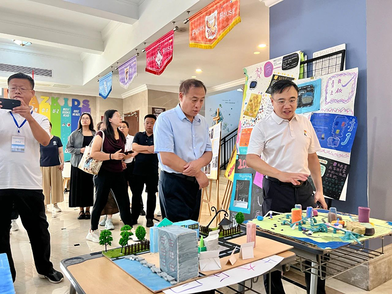 在融合部大廳,考察團駐足觀看了學生制作的IB-MYP學科探索展,并與校領(lǐng)導、教師代表親切交談,陳振祿詳細詢問了跨文化學科教研情況。當了解到學校已引進二十余名外籍專家時,他表示:“新華公學優(yōu)良的國際化師資隊伍是培養(yǎng)全球化人才的重要保障。”