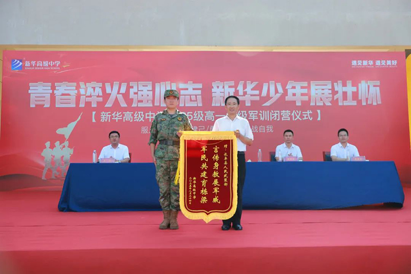 新華高級中學校長徐邦民向長豐縣人武部贈送了錦旗,表達學校對全體教官辛勤帶訓、嚴謹教導的衷心感謝。