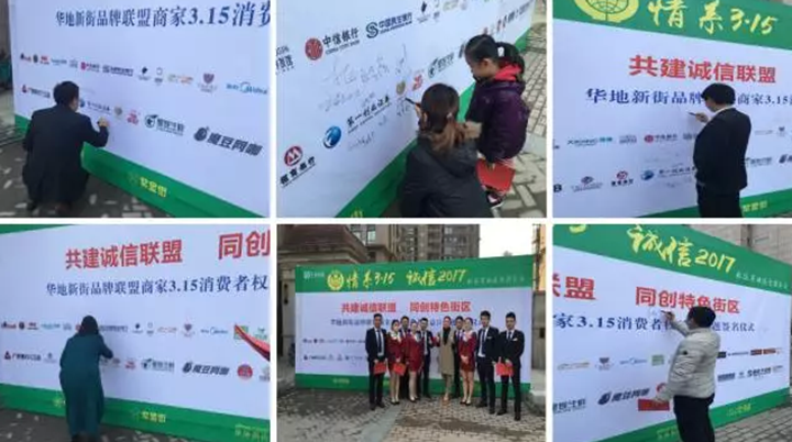 2017年3月15日,“華地新街品牌聯(lián)盟商家3·15消費者權(quán)益日”主題簽名儀式在華地新街隆重舉行。上午10時,各商戶代表齊聚在品牌墻下,由商業(yè)公司工作人員向大家宣讀并發(fā)放《倡議書》,各商戶代表在品牌墻上鄭重簽名,為共建誠信聯(lián)盟,共創(chuàng)特色街區(qū)而簽下鄭重的承諾。