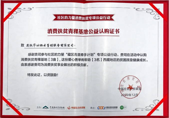 2020年12月12日,以“從脫貧攻堅到鄉村振興”為主題的中國社區扶貧聯盟第三屆理事會在上海隆重舉行。來自社會責任領域的專家學者、被幫扶對象代表以及眾多社會知名人士等共同參與本次盛會。本次大會總結2020年相關經驗和做法,研討未來可持續發展之路,并對年度表現突出的單位及個人予以表彰。華地物業榮獲“消費扶貧先鋒力量獎”、“消費扶貧理事單位”榮譽稱號、“青稞獎”多項殊榮,成為大會亮點之一。