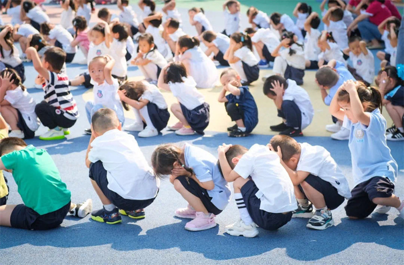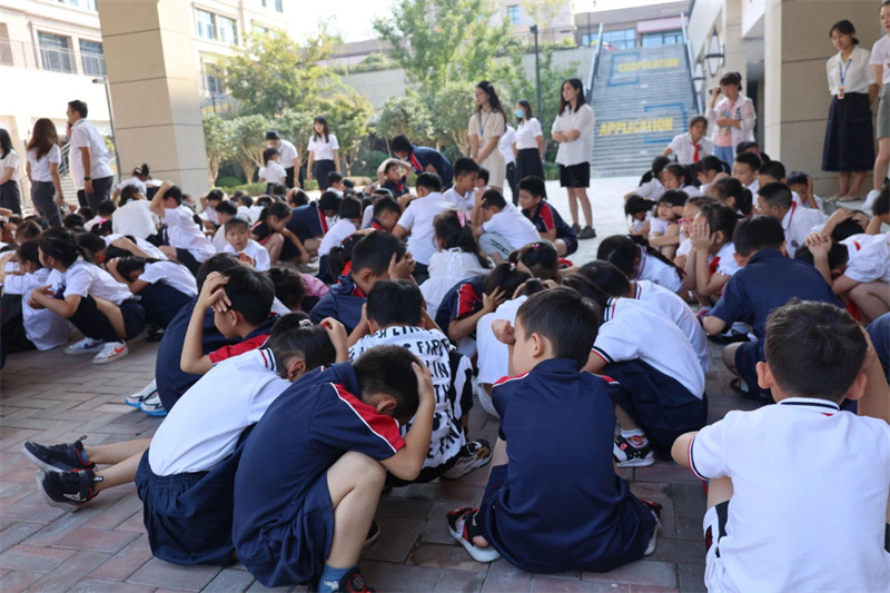 之后在凄厲的空襲警報聲中,大家立即抱頭蹲下或快速就近躲避,以防傷害。解除警報悠悠響起后,班級教師按照預定位置集中整隊,清點學生人數(shù),匯報疏散情況,演練順利完成。