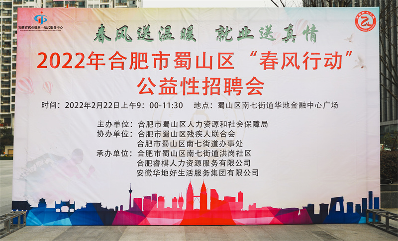 春風送溫暖,就業送真情。2月22日,由合肥市蜀山區人力資源和社會保障局主辦、合肥市蜀山區殘疾人聯合會、南七街道辦事處協辦、華地好生活集團承辦的2022年蜀山區“春風行動”公益性招聘會在華地金融中心廣場盛大舉辦。