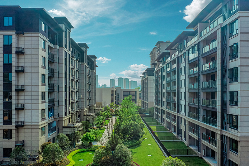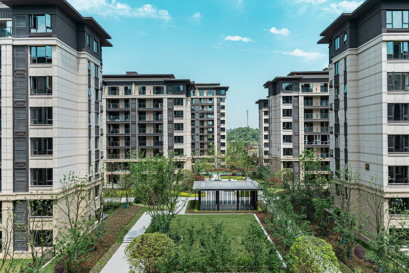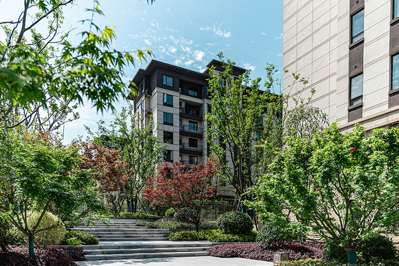 華地堅持以境造園,繪就詩意人生。景觀中軸由北至南,一脈貫穿,中軸線上匯聚多種珍貴樹種,呈四季斑斕,花香滿徑,樹影錯落,猶如一幅展開的畫卷,人于畫中游。