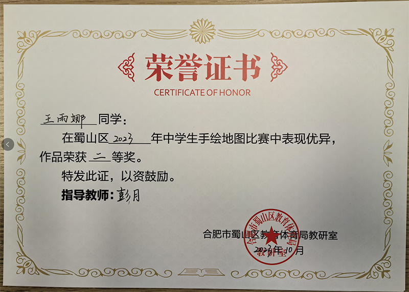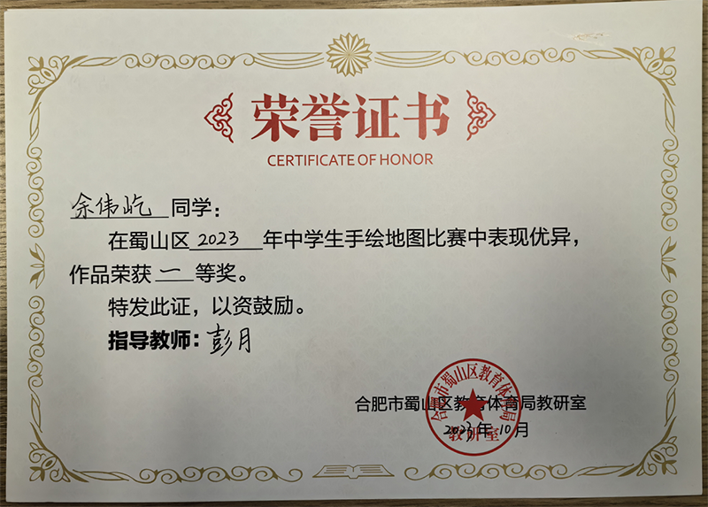 為了落實新課程標準,提升學生地理學科素養,增強學生的版圖意識,在國慶之際,蜀山區舉辦了地理學科2023年蜀山去中學生手繪地圖比賽。新華公學積極響應,參加了本次比賽并取得了優異成績。