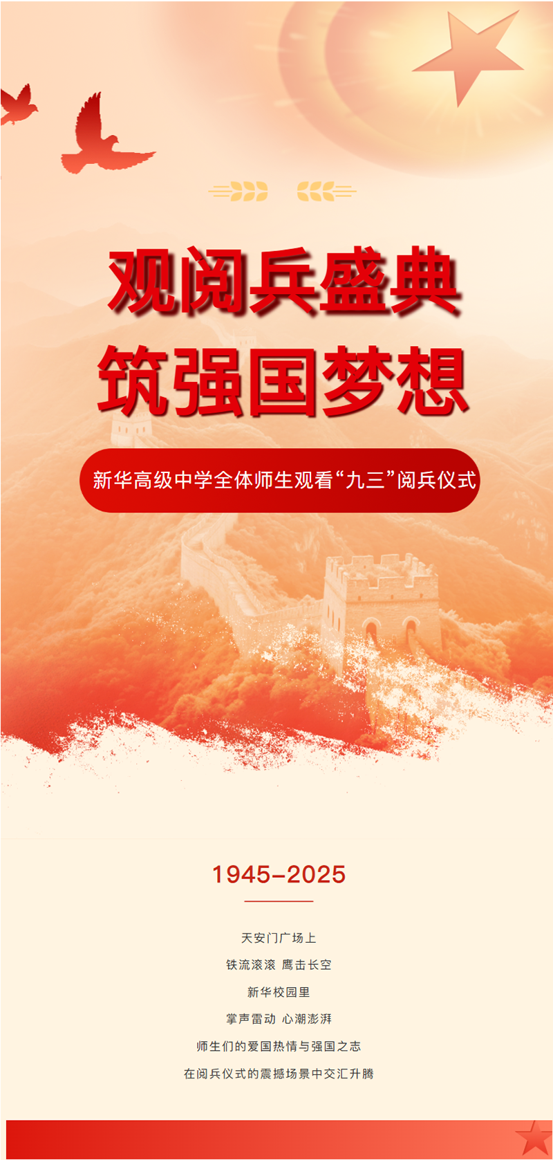 2025年9月3日上午,紀(jì)念中國(guó)人民抗日戰(zhàn)爭(zhēng)暨世界反法西斯戰(zhàn)爭(zhēng)勝利80周年大會(huì)在北京天安門(mén)廣場(chǎng)隆重舉行。為銘記歷史、緬懷先烈、珍愛(ài)和平、開(kāi)創(chuàng)未來(lái),激發(fā)全體師生的愛(ài)國(guó)熱情和民族自豪感,新華高級(jí)中學(xué)精心組織全體師生齊聚在報(bào)告廳、教室共同觀看了此次大會(huì)直播,感受偉大祖國(guó)的強(qiáng)盛與輝煌。